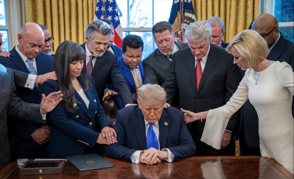 Dans un discours sur le bombardement de l’Iran, il a prié pour que Dieu protège ses troupes. Les représentants républicains ont formé un cercle de prière avant d’approuver une loi qui menace des millions d’Américains d’une perte totale d’aide alimentaire et médicale.